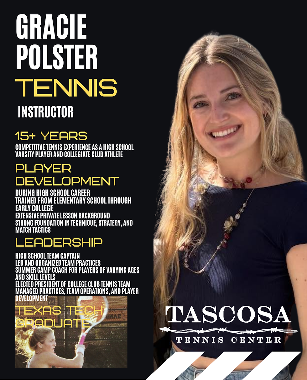 We are excited to welcome Gracie Polster to our TGC Tennis Teaching Team! Gracie will be working with out Team Tennis, leading group drills and clinics as well as available for private lessons! Additionally, Gracie will also join our Kinetic Strategies Inc team marketing and merchandising department! If you would like to meet Gracie or schedule a lesson, you can Book a Pro on Court Reserve or call our TGC Athletics Tennis Center 806-342-3051 ext 8.